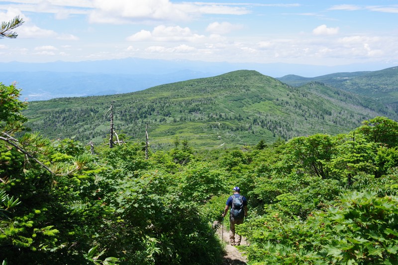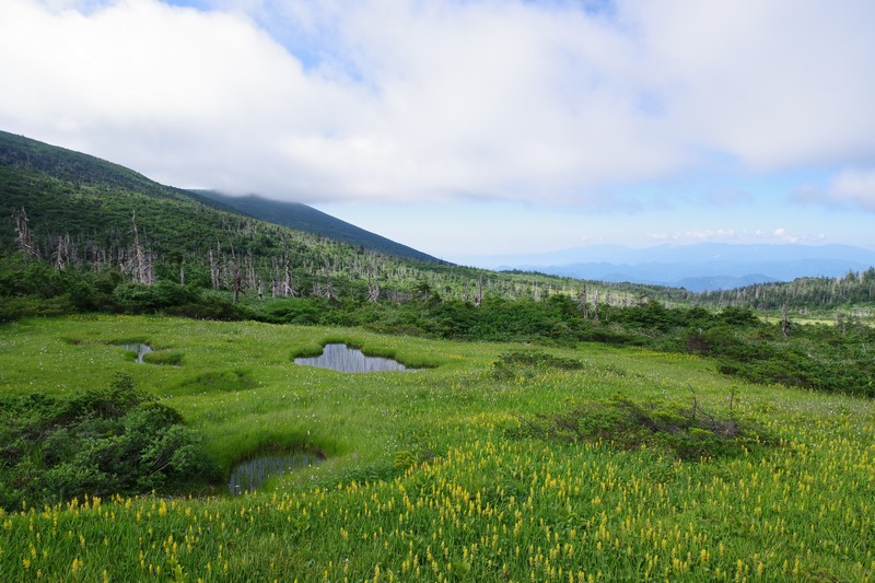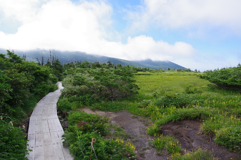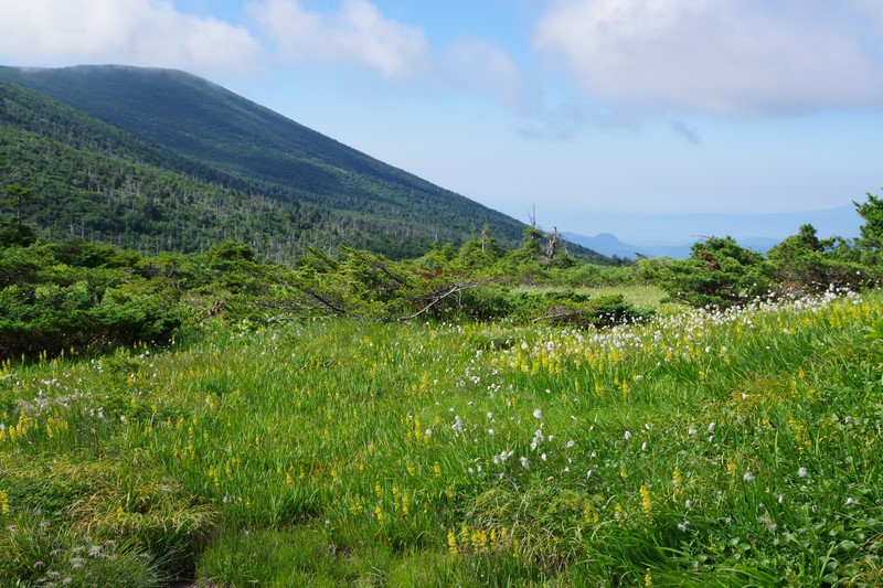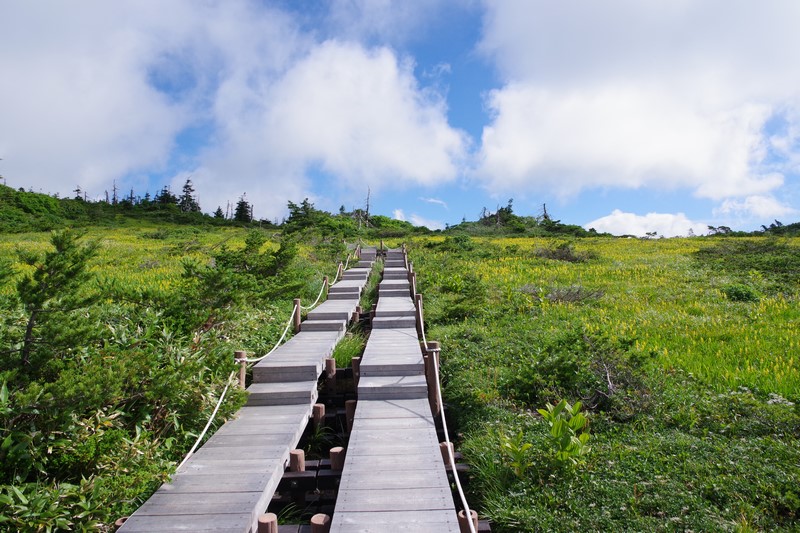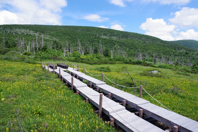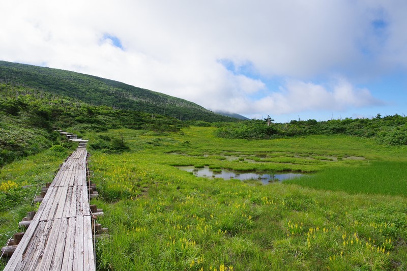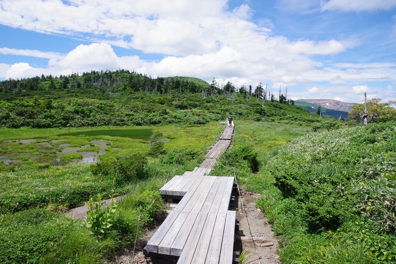 芝草平のベンチはルートから少し下ったところにあり、戻る時は当然登るがその時に見える湿原と青空は気持ちがいい。
